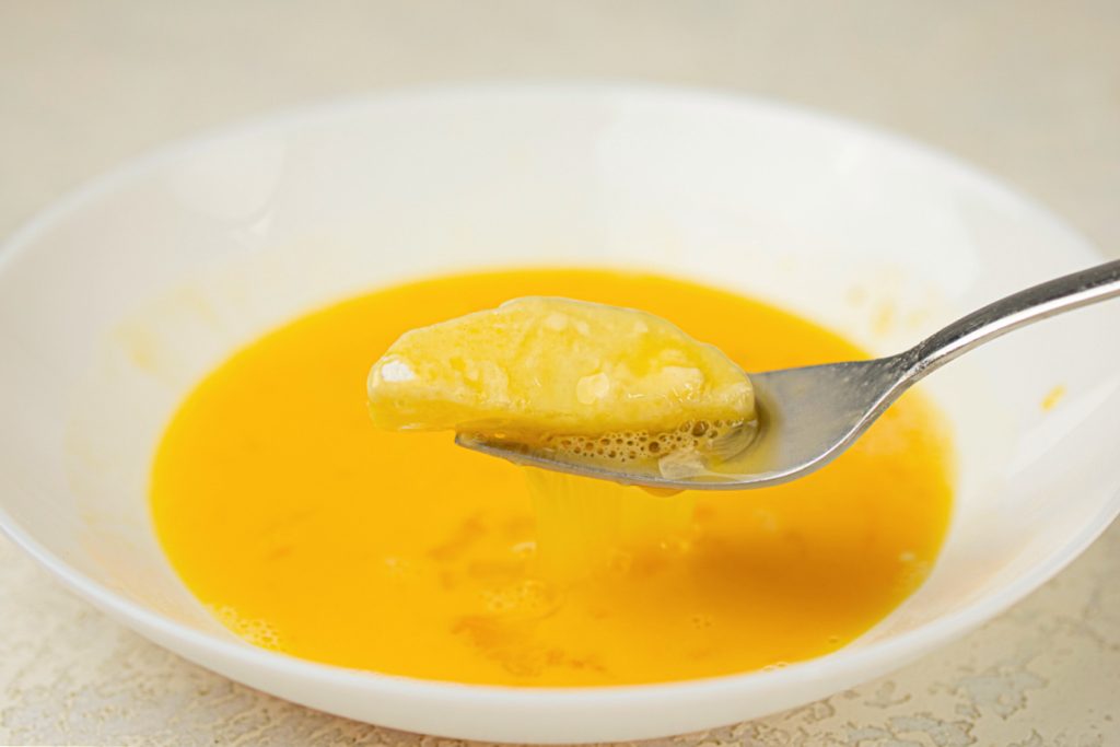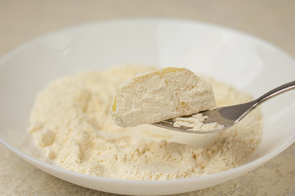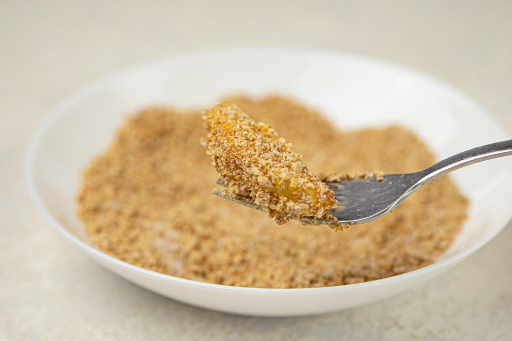 1. Set up a dredging station with a shallow bowl of flour, a shallow bowl of whisked egg mixture, and a shallow bowl of graham cracker crumbs and sugar.