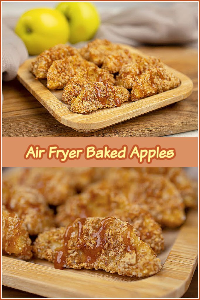 1. 1. Rinse apples, core and peel (optional) Cut apples into wedges. Have three shallow dishes ready with flour, whisked egg and water mixture.2.    Dip each wedges in flour, then eggs/water, then into cookie crumbs. 4.   Mix cookie crumbs with sugar. Roll apples in cookie crumbs. Spray air fryer with a little cooking spray. 5.   Place prepared apple wedges into the air fryer. Cook 400 degrees for 5 to 8 minutes. Check and if needed put back in for another 1 to 2 minutes until desired crispiness. Drizzle caramel sauce over each apple.  Best when served right away. Enjoy!