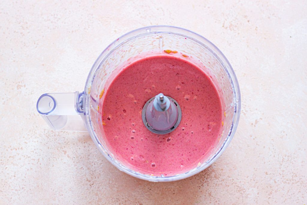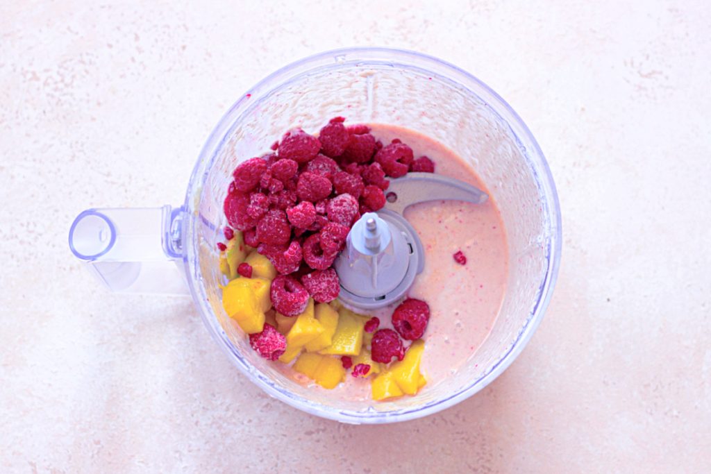 2. Add in the frozen fruit. While again. Stop and scrape down the sides. Mix until all is blended and smooth.
