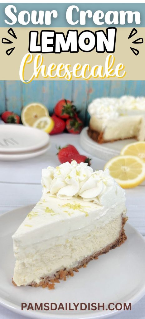 This Sour Cream Lemon Cheesecake has a buttery graham cracker crust, a sweet cheesecake filling, and is finished off with a delicious sour cream and lemon layer.